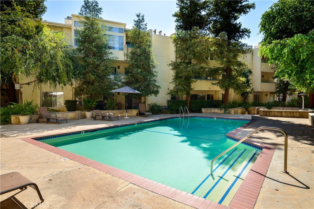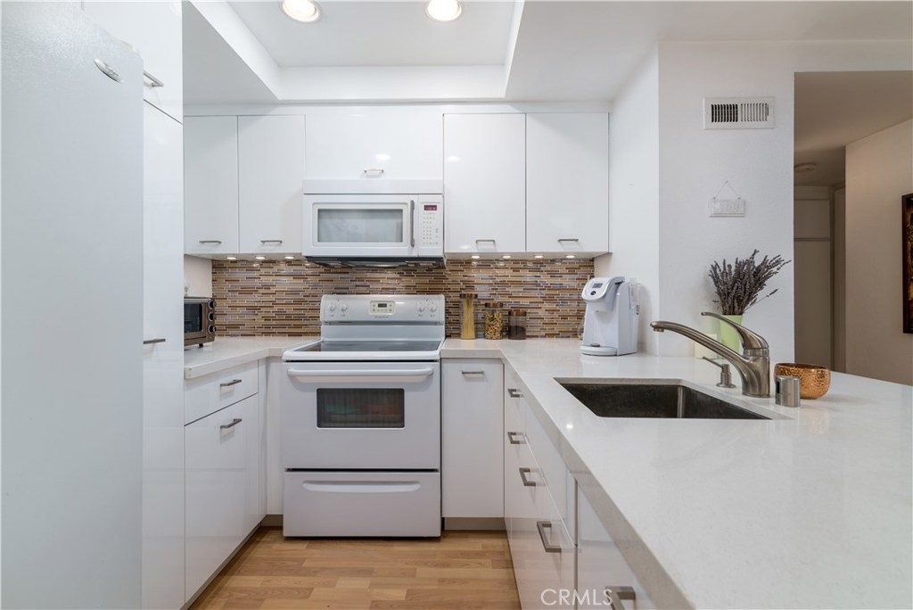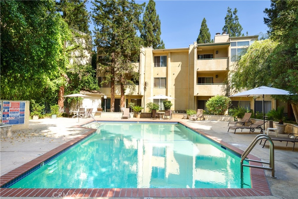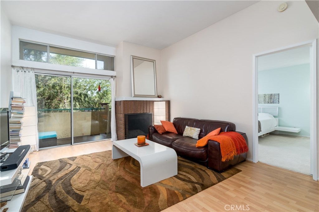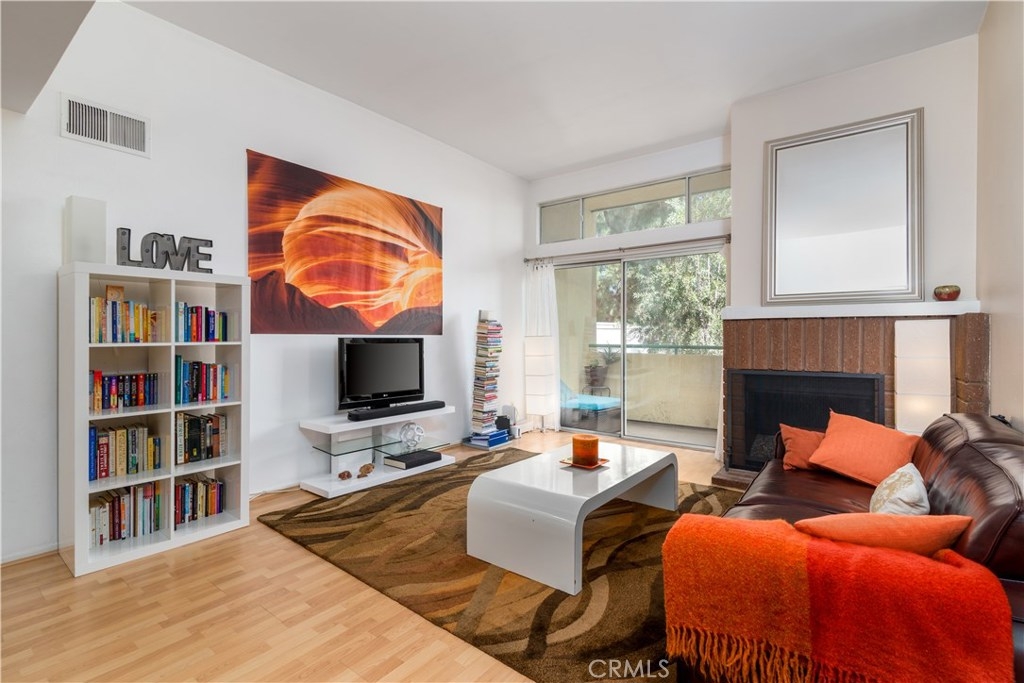 Beautiful Top floor unit with vaulted ceilings and views of the hills & treetops in a lovely landscaped complex-most beautiful complex in the area. Great Location, just 5 minutes away from the Village. Excellent floor plan. Gorgeous remodeled kitchen with upgraded white high gloss cabinets, Quartz countertops, & sharp modern backsplash. All appliances included: fridge, microwave, dishwasher, stove, and stackable washer dryer. Laminate flooring throughout the kitchen, dining, living room and hallway with upgraded fireplace in living room. Doves and hummingbirds visit the large balcony regularly! Generously sized master bedroom with en-suite dual sink vanity and bathroom with shower. The second bedroom and bath are on the opposite side of the unit. This is great for privacy and or roommates. This unit only shares a wall on one side (very quiet). The complex amenities include pool, Jacuzzi , and tennis courts. Located a few minutes away from the Village, Westfield Topanga mall, dozens of restaurants, green parks, and more. This unit offers two parking spots in carport with extra storage. Pet friendly building. HOA includes Water, trash, sewer, & earthquake insurance. Great opportunity to own your own home. Come see it. BRAND NEW AC UNIT /TEN YEAR WARRANTY included.