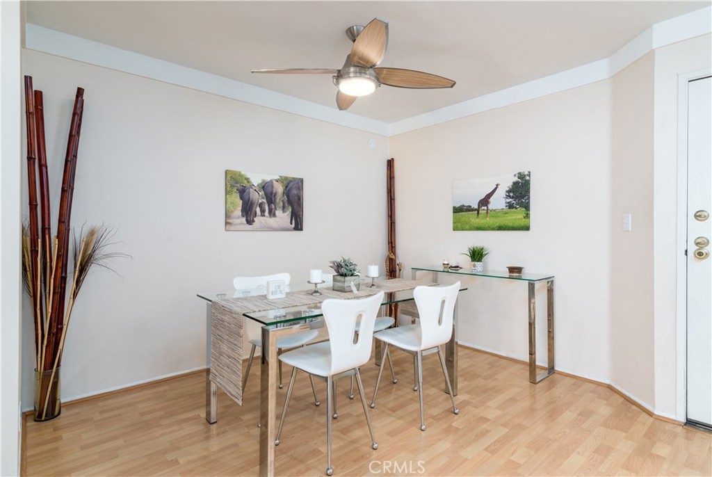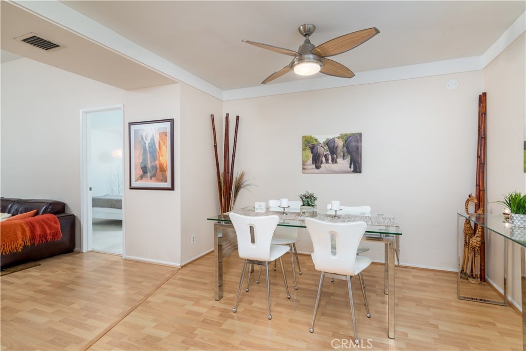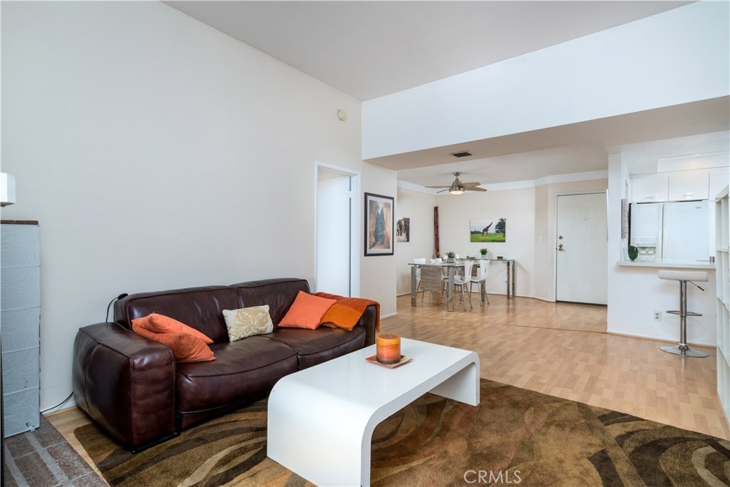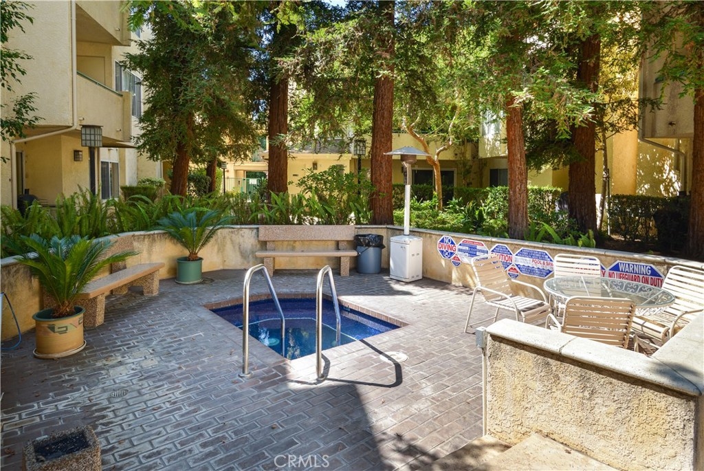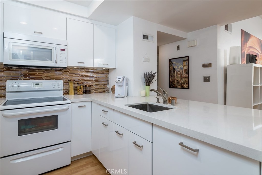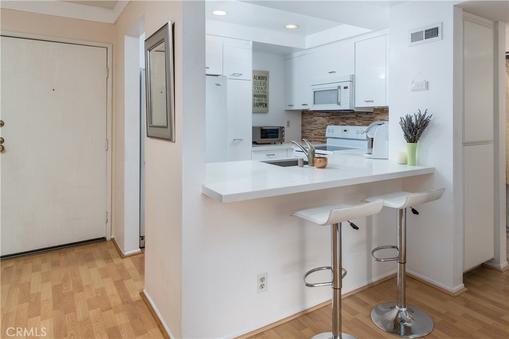 Beautiful Top floor unit with vaulted ceilings and views of the hills & treetops in a lovely landscaped complex-most beautiful complex in the area. Great Location, just 5 minutes away from the Village. Excellent floor plan. Gorgeous remodeled kitchen with upgraded white high gloss cabinets, Quartz countertops, & sharp modern backsplash. All appliances included: fridge, microwave, dishwasher, stove, and stackable washer dryer. Laminate flooring throughout the kitchen, dining, living room and hallway with upgraded fireplace in living room. Doves and hummingbirds visit the large balcony regularly! Generously sized master bedroom with en-suite dual sink vanity and bathroom with shower. The second bedroom and bath are on the opposite side of the unit. This is great for privacy and or roommates. This unit only shares a wall on one side (very quiet). The complex amenities include pool, Jacuzzi , and tennis courts. Located a few minutes away from the Village, Westfield Topanga mall, dozens of restaurants, green parks, and more. This unit offers two parking spots in carport with extra storage. Pet friendly building. HOA includes Water, trash, sewer, & earthquake insurance. Great opportunity to own your own home. Come see it. BRAND NEW AC UNIT /TEN YEAR WARRANTY included.