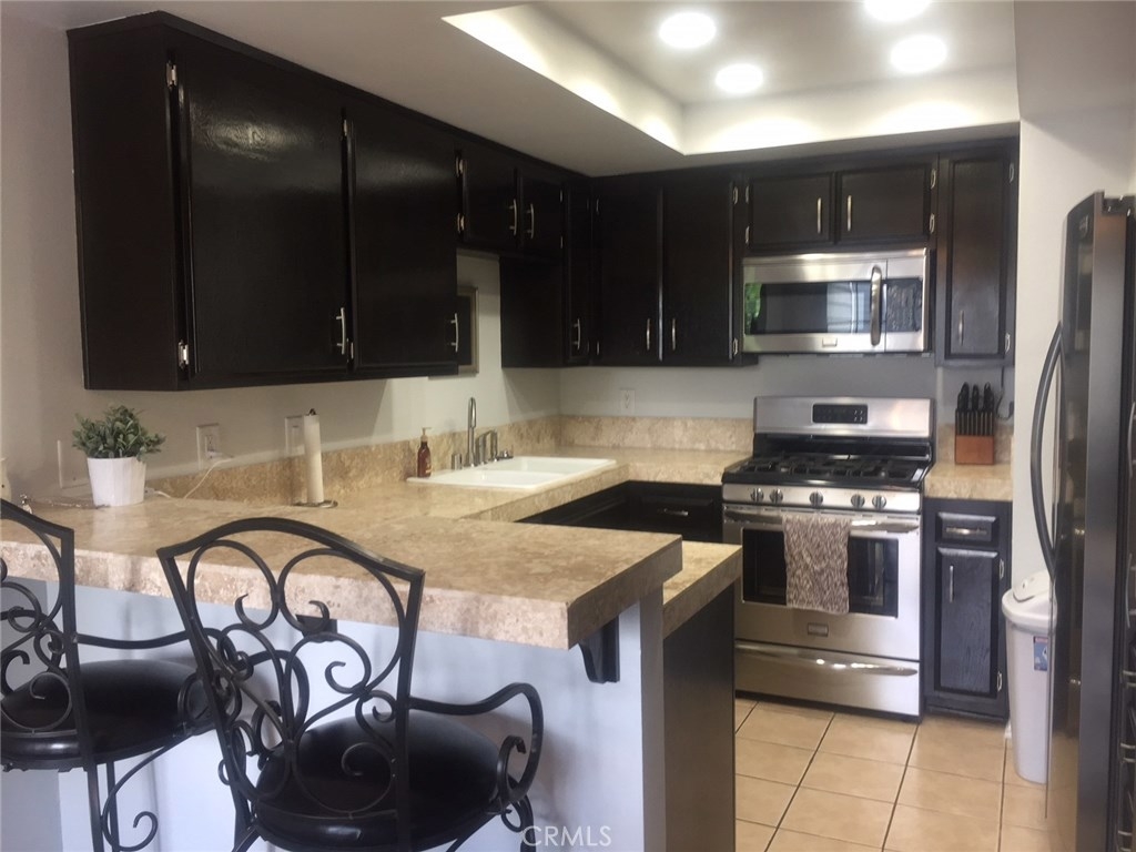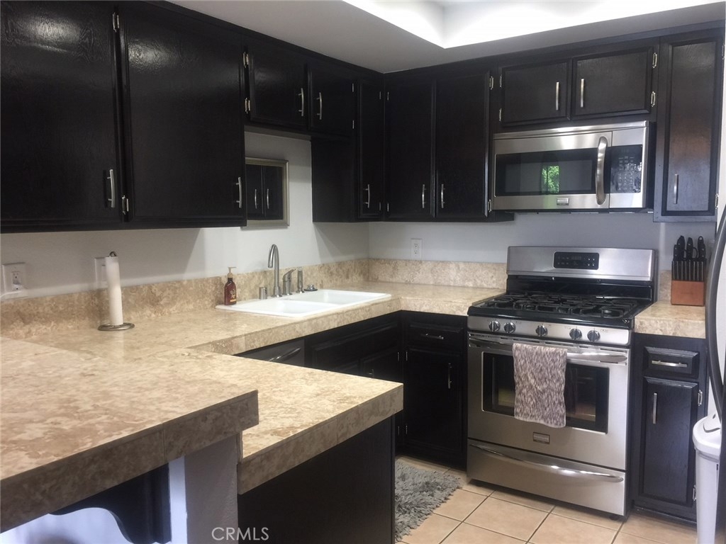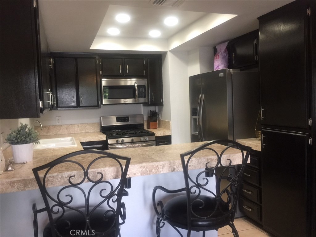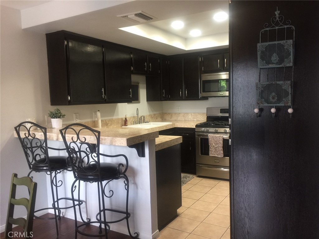 Lovely 2 Bedroom 2 Bath Condominium in a beautiful gated community. The complex is well maintained with lush landscaping, Fenced pool area and Tennis Court. This is a ground floor unit with a private outside patio area " great for relaxing " There are 2 Covered Tandem parking spaces for your convenience on the west side of the building under the unit, also a storage room with the water heater. Centrally located close to The Topanga Mall, The Village, Warner Center ,Shopping, Public Transportation, Entertainment and many Fine Dining Spots. The interior was recently painted and the ceilings were redone to a smooth finish. The Heating and Air Conditioning are approximately 3 1/2 years old. The Kitchen Cabinets were redone, counter tops are granite tiles, and the appliances were replaced with stainless steel ones. The Master Bedroom has it's own private Bath and walk in closet (Includes a Safe bolted to the closet floor) New Closet Doors are ordered for the 2nd bedroom. The Dining Area, Living Room and Hallway have beautiful Wood Flooring. Both bedrooms are carpeted ( just professionally cleaned 05/21/18 ). Bathrooms and kitchen have Tile flooring. This Unit won't last long, Very Desirable Complex!