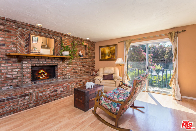 REDUCED BY OVER $20,000 this is the best unit on the market! Ideal for entertaining, bright 1 bedroom, 1 bathroom condo with wood floors in the living room which includes a wet bar, a remarkable brick fireplace, and a fully equipped entertainment center professionally installed. Sliding glass door leads to a private balcony overlooking a grassy front yard. The tiled kitchen includes a refrigerator, stove, dishwasher and microwave. Carpeted extra large bedroom with walk in closet. In unit washer and dryer, HVAC, dual paned windows, built ins, recessed lighting throughout and an in unit extra large hidden storage cubby. Low HOA fees. Designed by the Builder for his personal home. 6 unit complex located on a quiet cul-de-sac street which is convenient to shopping, restaurants, Parthenia Park and the Northridge Mall.