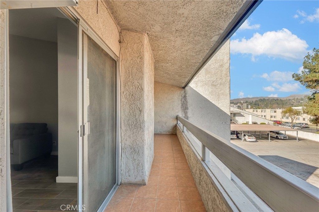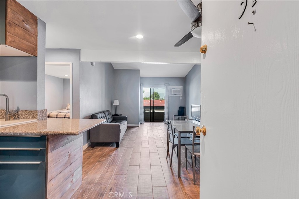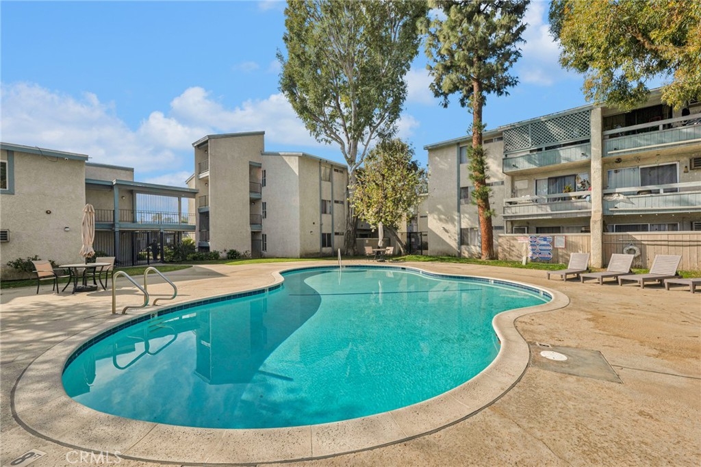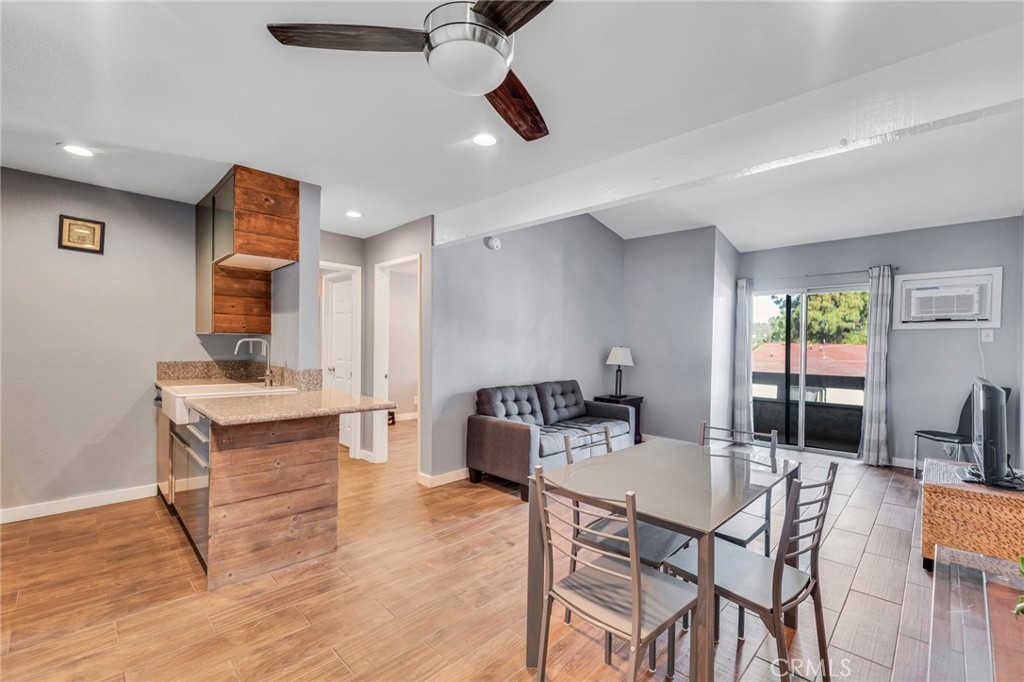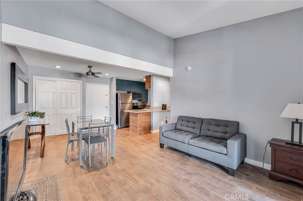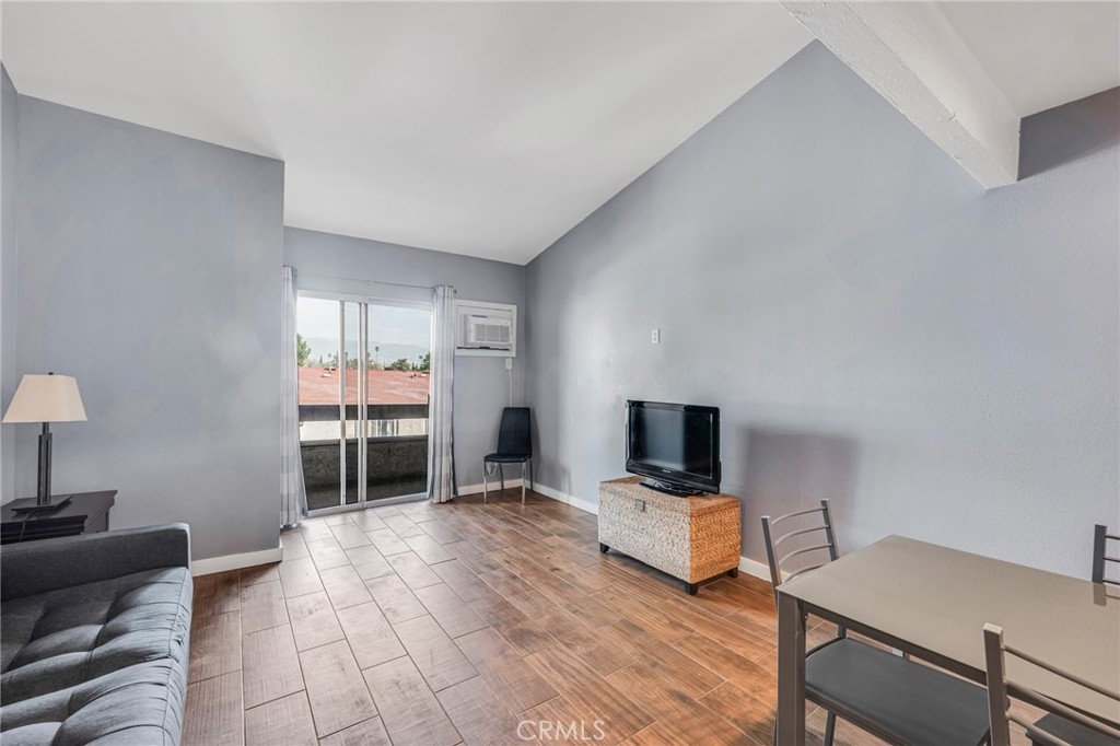 Welcome to this beautifully updated 1-bedroom, 1-bathroom top-floor corner unit condo in the desirable Olive Creek gated community of Canoga Park! With 511 sqft of well-designed living space, this home offers modern upgrades, abundant natural light, and a fantastic open floor plan. Step inside to discover a spacious living room with soaring vaulted ceilings, recessed lighting, and sleek wood-like flooring that extends throughout. The living room and dining area enjoy ample sunlight from the sliding patio door, creating a bright and inviting atmosphere. The spacious outdoor patio, accessible from the living room, spans the full length of the unit, providing the perfect space for relaxation, outdoor dining, or enjoying fresh air. The updated kitchen features newer cabinets with plenty of storage, granite countertops, a farmer’s sink, and all essential appliances. A ceiling fan, newer in-wall A/C unit, and a convenient storage closet add to the unit’s functionality in the common area. The bedroom is generously sized and includes a walk-in closet, recessed lighting, and a window that connects to the expansive full-length patio—perfect for enjoying fresh air and sunlight. The ensuite bathroom boasts an extended vanity, updated flooring, a full shower, and dual entry points for added convenience. Olive Creek offers fantastic amenities, including a large pool and spa, multiple laundry rooms, gated and covered tandem parking, a secure mail room, and multiple gated entrances for peace of mind. This move-in-ready home is perfect for first-time buyers, downsizers, or investors looking for a fantastic property in a prime location. Don't miss this opportunity—schedule your showing today!
