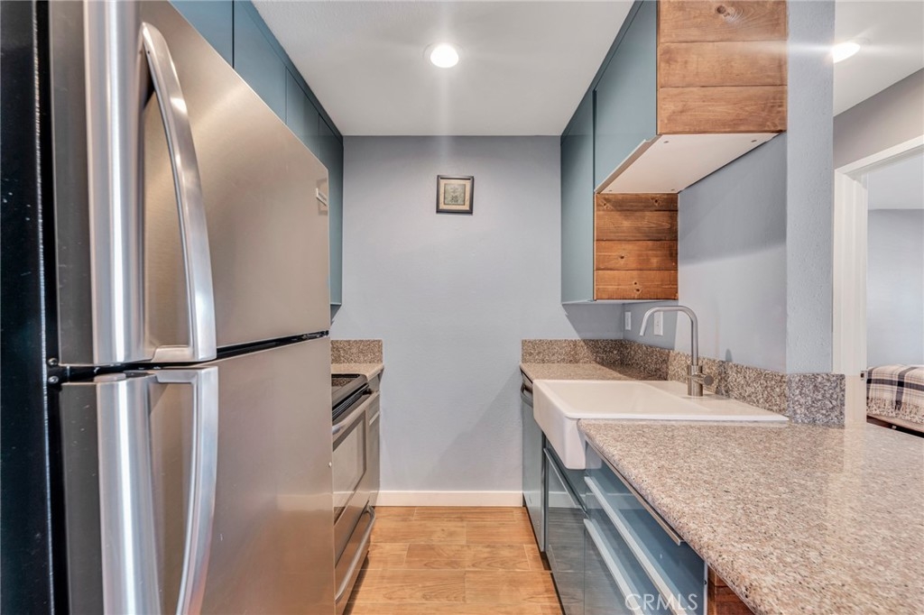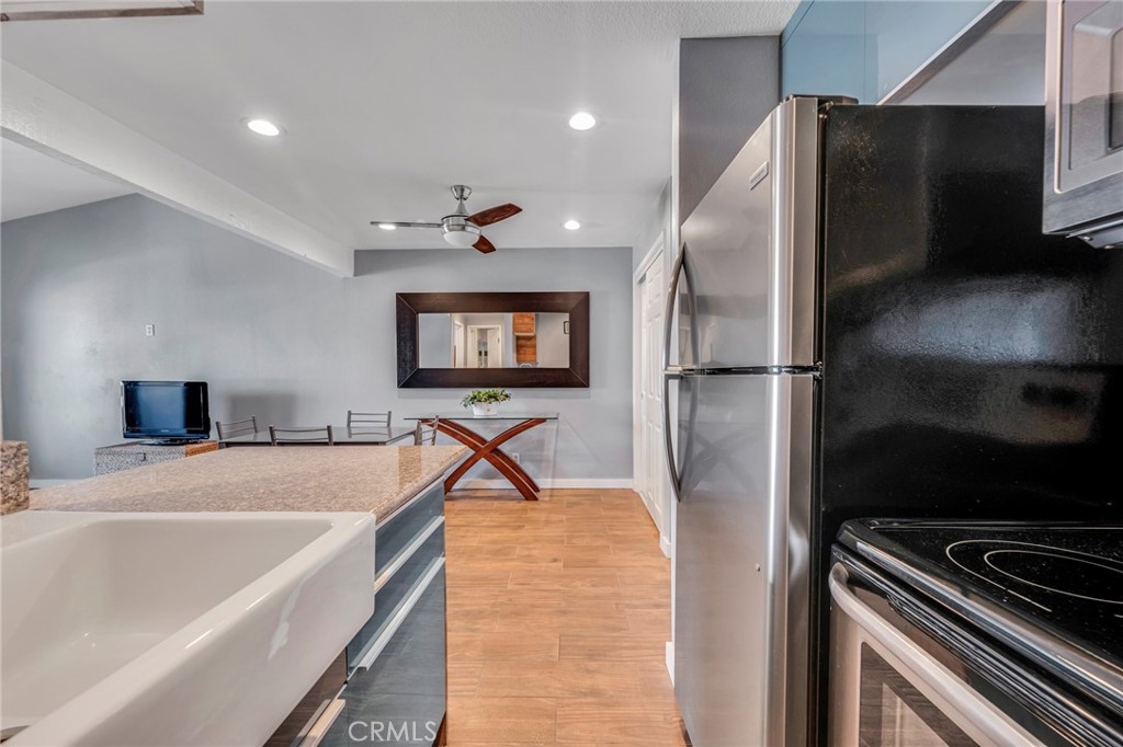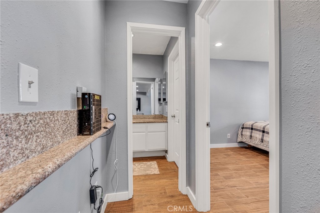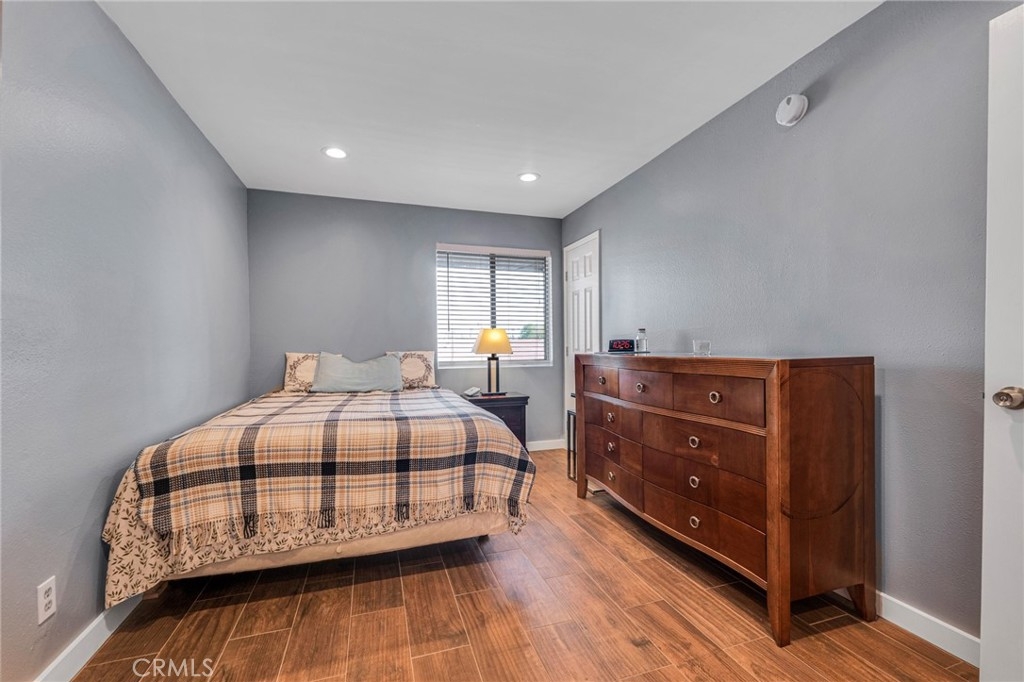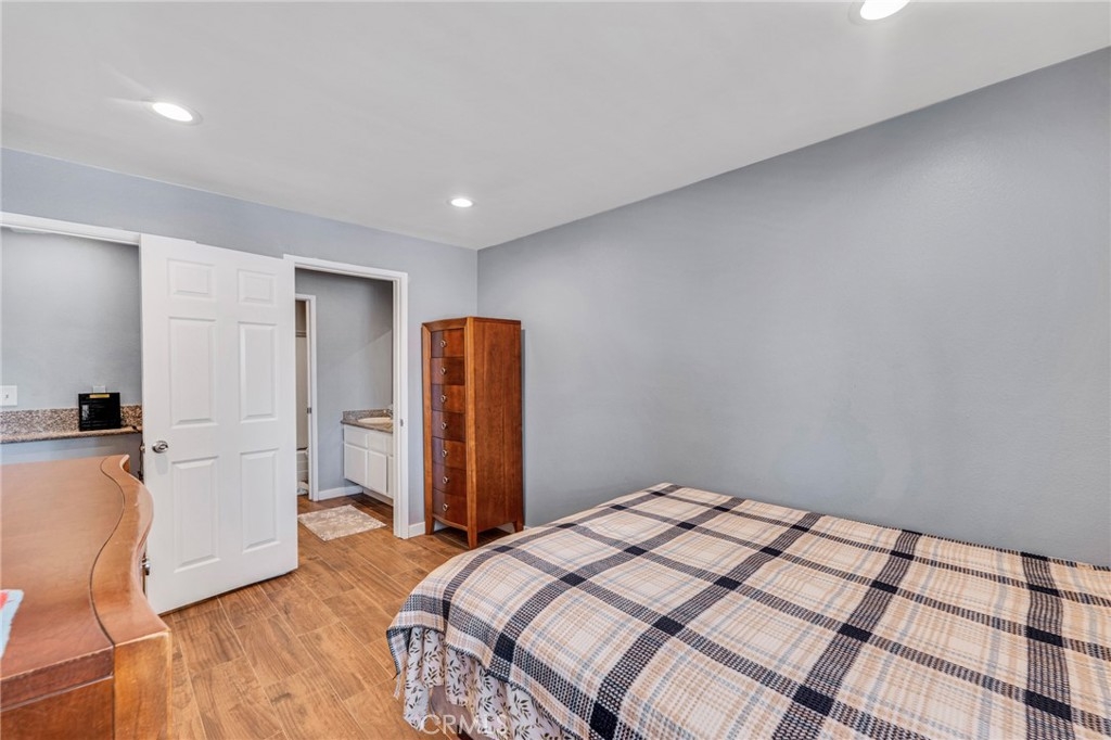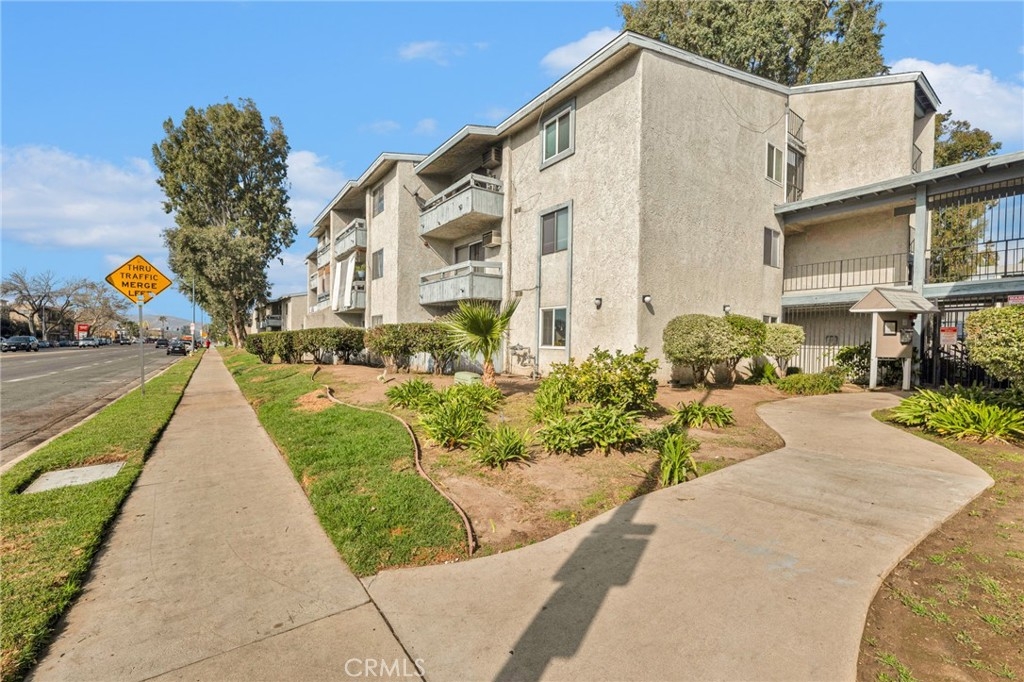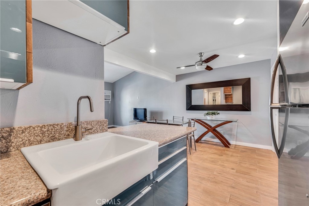 Welcome to this beautifully updated 1-bedroom, 1-bathroom top-floor corner unit condo in the desirable Olive Creek gated community of Canoga Park! With 511 sqft of well-designed living space, this home offers modern upgrades, abundant natural light, and a fantastic open floor plan. Step inside to discover a spacious living room with soaring vaulted ceilings, recessed lighting, and sleek wood-like flooring that extends throughout. The living room and dining area enjoy ample sunlight from the sliding patio door, creating a bright and inviting atmosphere. The spacious outdoor patio, accessible from the living room, spans the full length of the unit, providing the perfect space for relaxation, outdoor dining, or enjoying fresh air. The updated kitchen features newer cabinets with plenty of storage, granite countertops, a farmer’s sink, and all essential appliances. A ceiling fan, newer in-wall A/C unit, and a convenient storage closet add to the unit’s functionality in the common area. The bedroom is generously sized and includes a walk-in closet, recessed lighting, and a window that connects to the expansive full-length patio—perfect for enjoying fresh air and sunlight. The ensuite bathroom boasts an extended vanity, updated flooring, a full shower, and dual entry points for added convenience. Olive Creek offers fantastic amenities, including a large pool and spa, multiple laundry rooms, gated and covered tandem parking, a secure mail room, and multiple gated entrances for peace of mind. This move-in-ready home is perfect for first-time buyers, downsizers, or investors looking for a fantastic property in a prime location. Don't miss this opportunity—schedule your showing today!