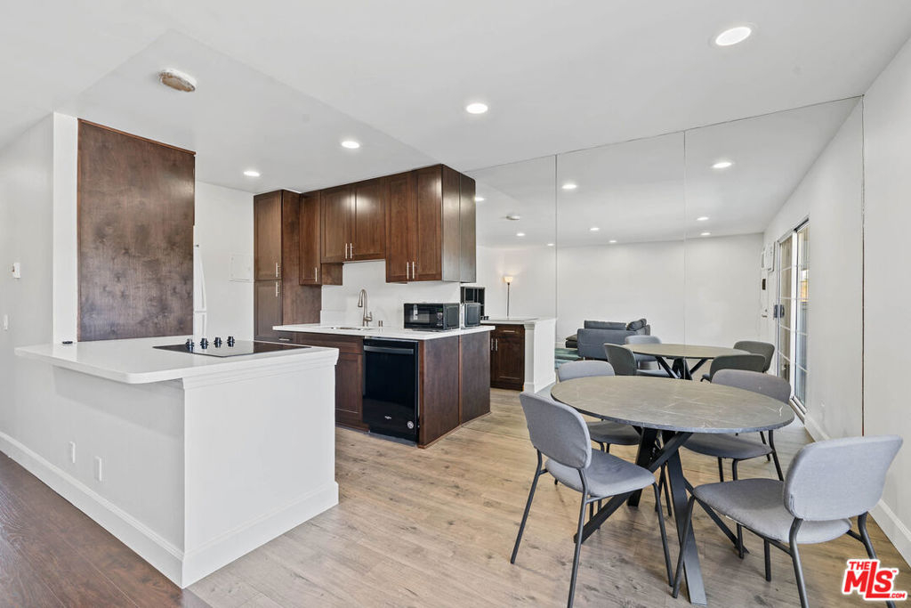 Charming and well-lit, upstairs unit offers a modern living experience. Enjoy the bright ambiance enhanced by energy-efficient LED recessed lighting, wood plank-laminated flooring and admire the elegant 5 1/4 base molding that flows seamlessly throughout. The renovated kitchen boasts an electric cooktop, dishwasher, and stylish cabinetry with soft closing hinges and slides. Quartz countertops, undermount pull-out kitchen faucet, and spacious pantry add a touch of sophistication. The full bathroom features Quartz countertops, a vessel sink, and a single-handle tall vessel faucet, exuding a spa-like atmosphere. Outside, enjoy your own private balcony, a perfect spot to unwind and enjoy the fresh air. Convenience is key, within close proximity to nearby shopping, restaurants, and grocery stores. Experience privacy with no upstairs neighbors and relish the tranquil atmosphere within this gated community. Enjoy leisure time at the community pool and appreciate the ease of having 2 garage parking spaces. This gem offers an ideal blend of comfort, style, and convenience.