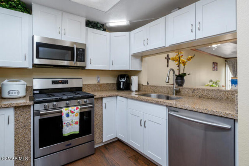 Welcome home to this upgraded 2 bedroom, 2 bathroom condo located in a 42-unit gated complex.This single level property is upgraded with a new kitchen that includes white shaker cabinets, granite counters and stainless steel appliances. The flooring in the kitchen is wood-like tile and the flooring in hall, living room and dining room is a nice wood laminate.The cozy living room has a beautiful stack stone fireplace, a new slider to small patio and opens to dining room and kitchen. The hall bathroom has been updated with tile surround over the tub, a new low flow toilet, cabinet and mirror. Inside laundry is located in the hall bathroom. This home has dual pane windows throughout.The master bedroom has an attached full bathroom with partial upgrades. This property has been well cared for by its owners and is move-in ready.Located near pool and the elevator to the subterranean parking garage, this comes with two parking spots allocated in a tandem formation and additional storage unit in locked area.Units in this complex rarely come up for sale, don't miss this great opportunity!