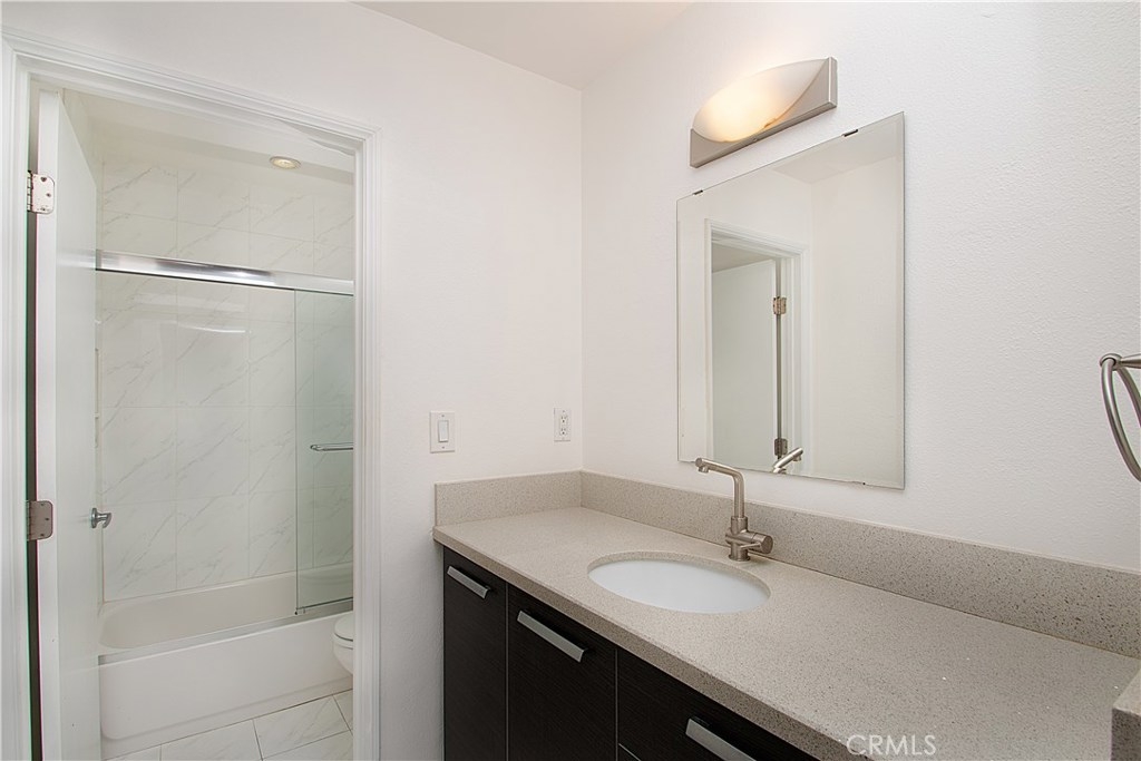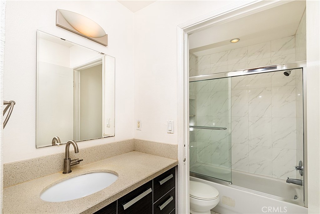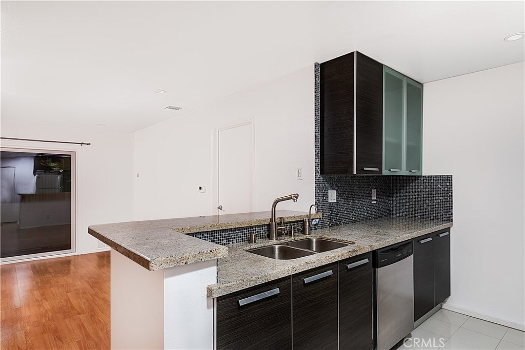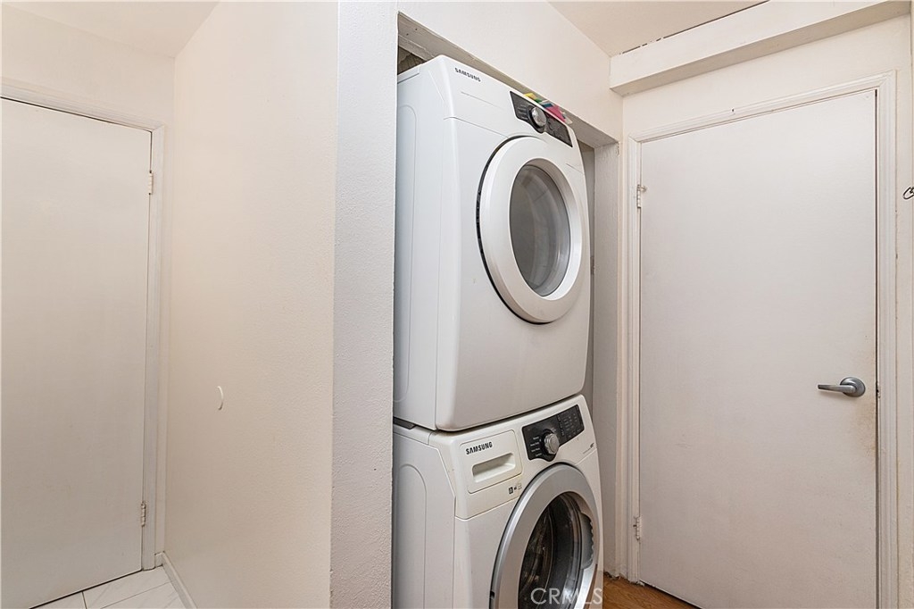 This ONE of a kind END unit is perfect for any Buyer, Investor, or First Time Owner!! This second floor single level condo is the ONLY unit in the building to offer an interior washer / dryer, and also features central air & heat, two assigned parking spaces, updated kitchen and bathrooms, private patio balcony with a mature shade tree. Living room opens to gleaming laminated wood flooring with honey colored tones throughout, recessed lights, and open views to the kitchen and dining area. Kitchen showcases granite counter tops, glass tile backsplash, ultra-modern cabinetry and built-in stainless steel appliances. The bedrooms area generously sized and offer sliding wall closets, vanity / dressing area, private FULL shower tub enclosures and quartz counter bathrooms . Building offers an elevator for your convenience. Low HOA Fee. Close to shopping, freeways, dining, parks, schools, and more, this move-in ready unit is waiting for you.