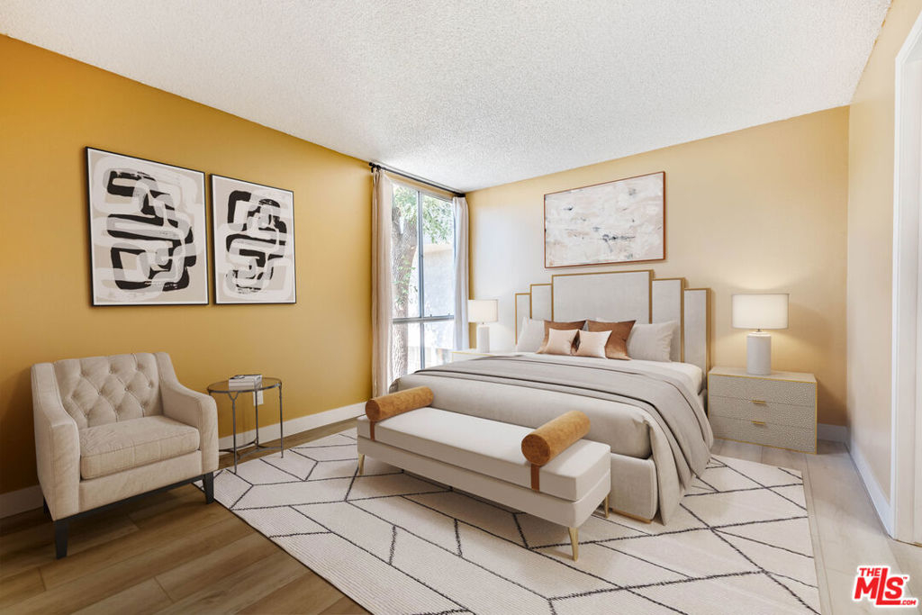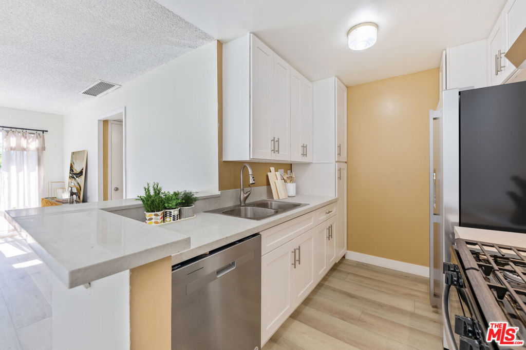 Remodeled 3 Bed 2 Bath condo with updated modern kitchen, bathrooms, and wood-like flooring throughout. Take advantage of this Spacious Single level unit on the bottom floor with 1,078 SF in Canoga Park, one of the best values in the area!! Quiet location, open floor plan includes large spacious living room and dining which opens to the kitchen. This light-filled unit includes a large slider in the living room leading to the patio, and new baseboards and drapes throughout. Kitchen features include new quartz countertops, white cabinets, stainless steel stove, dishwasher, and sink. Bathroom features include new vanities and countertops, toilets, new shower door, and fixtures. Gated community with gated parking includes one assigned spot, and possibly a 2nd can be rented. Community laundry, pool, spa, mailroom, and clubhouse. HOA includes gas, water, sewer, and trash. Close to park and conveniently located near transportation, shopping and restaurants.