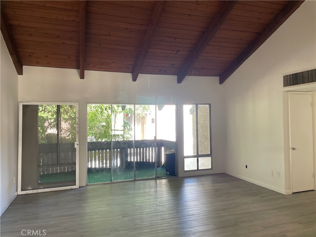 Top floor unit with lots of natural light. This 3 bedrooms 2 bath condo is in move-in condition. Kitchen with new stove, dishwasher, new floor and new painting. This is one of the special units with high cathedral ceiling in the living room. Brand new designer flooring in bedrooms. Tile throughout the rest of the unit. Large master bedroom with his and her closets. Lots of windows and very bright. The sliding glass door leads you to a large balcony overlooking treetops. One of the best parking spaces, covered and close to entry steps. The complex has a swimming pool, clubhouse, BBQ area and laundry room.