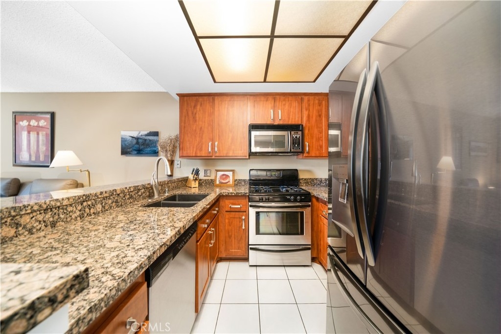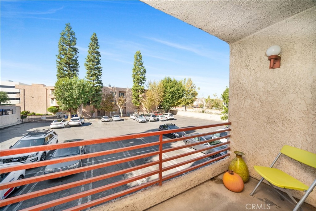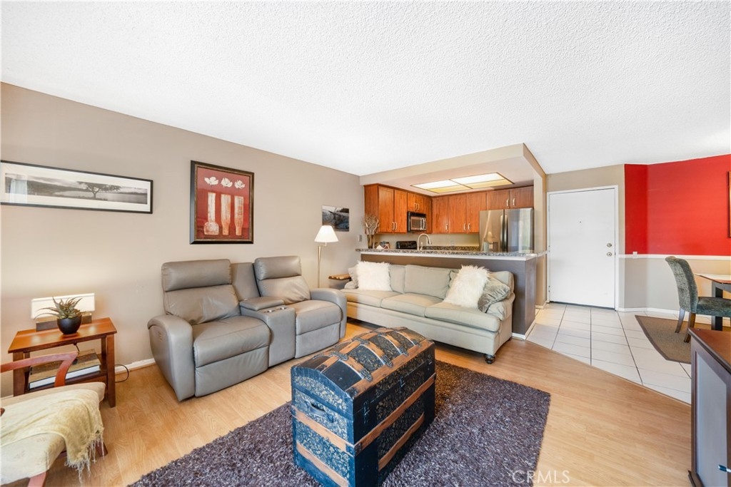 Prime Warner Center adjacent complex located within the perimeter of the highly revered The Village at Warner Center project. Beautiful unit with lots of upgrades in an ideal location within the complex. Stunning kitchen with granite counters, large crushed granite double sink, matching Frigidaire stainless-steel appliances, new cabinet doors and drawers with stainless door handles and breakfast counter. Lovely dining area with dimmable chandelier to set the mood for a romantic dinner or create a relaxing mood for the holidays. Beautiful laminate bamboo like flooring in Living room, tile in kitchen and formal dining and newer carpet in both bedrooms. Designer custom paint, wainscoting and open floor plan will accommodate a quality lifestyle in a condo living. Large coat closet. Large primary bedroom has walls of closets with custom closet organizers and bamboo window treatments and an alcove for additional dresser area. Full size laundry closet inside the unit with storage shelving. Lovely balcony to enjoy the sunsets has a large storage closet. It is perfect for a BBQ and for alfresco dining. The community provides a sparkling pool and spa, tandem parking and a wonderful well-kept complex. Very close and convenient to shopping, dining and entertainment. Close to public transportation and easy access to freeways and sunny California beaches.