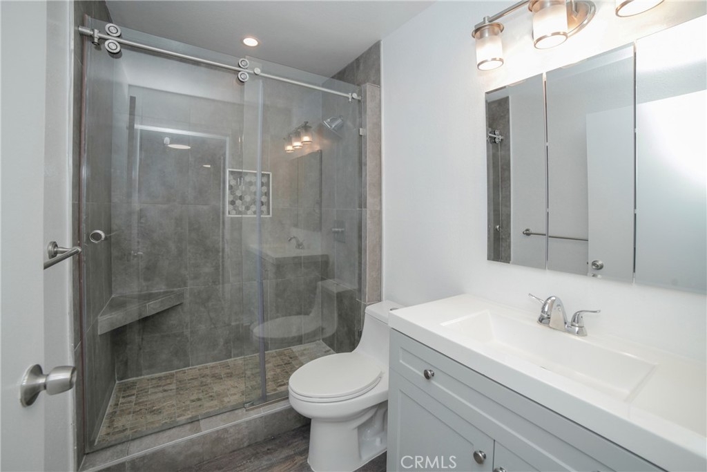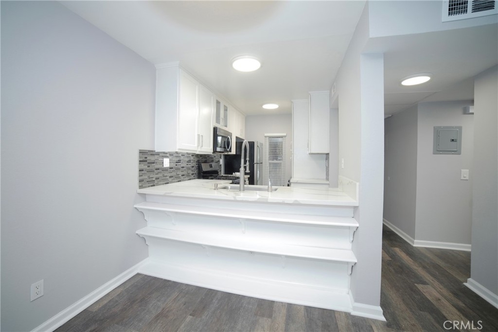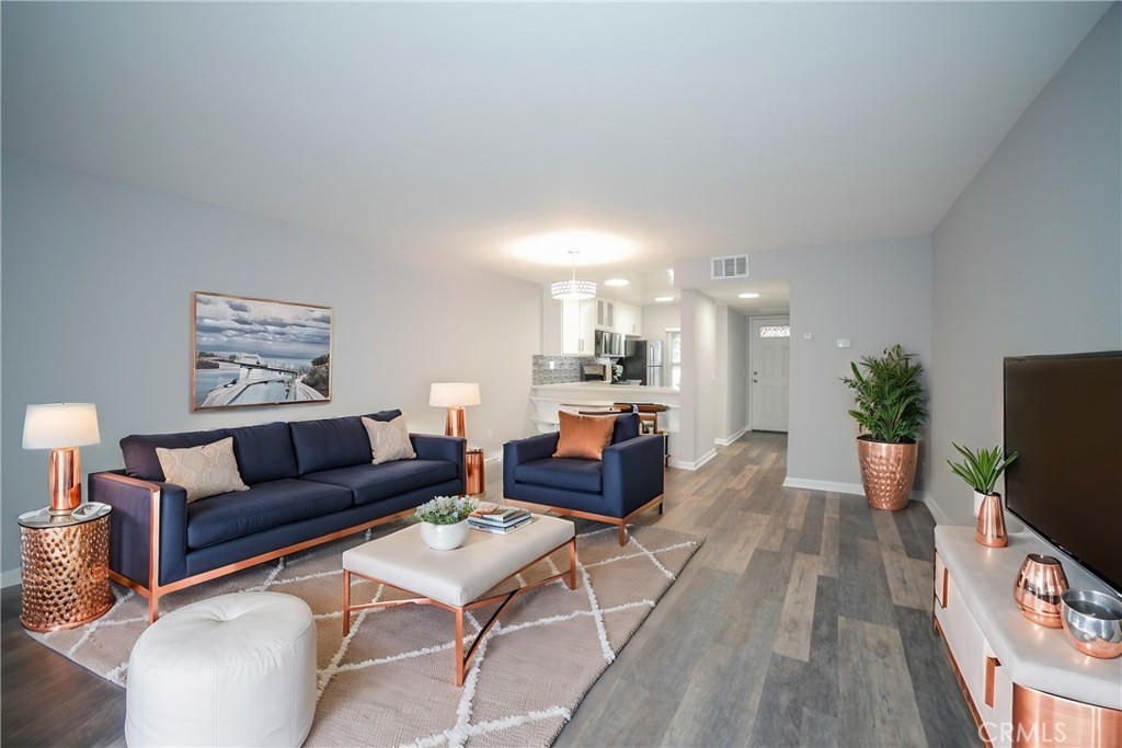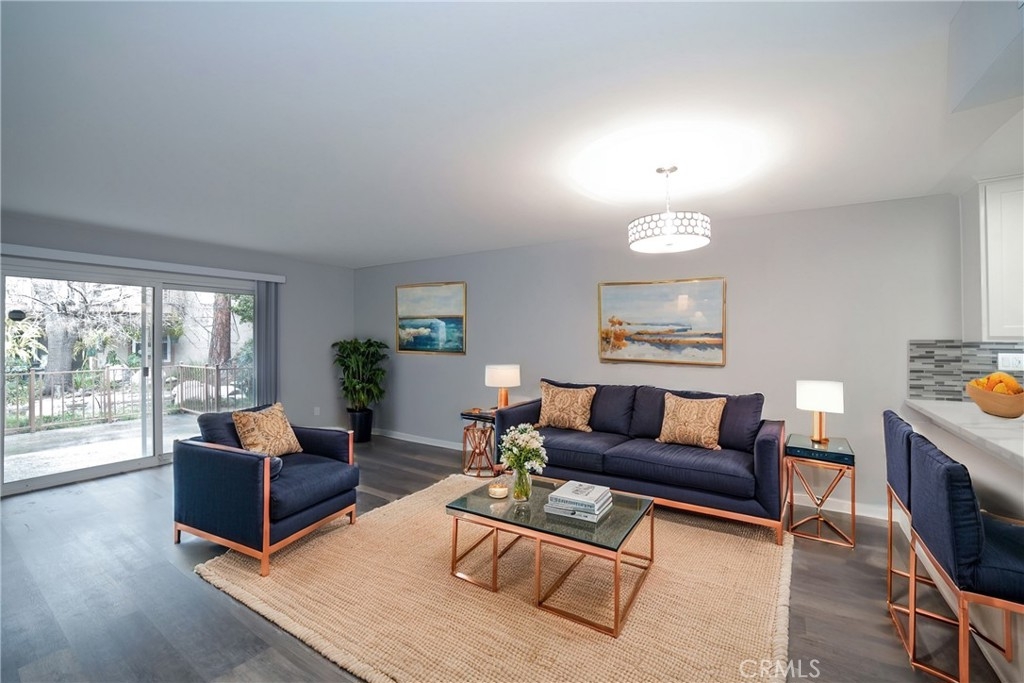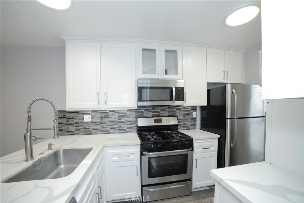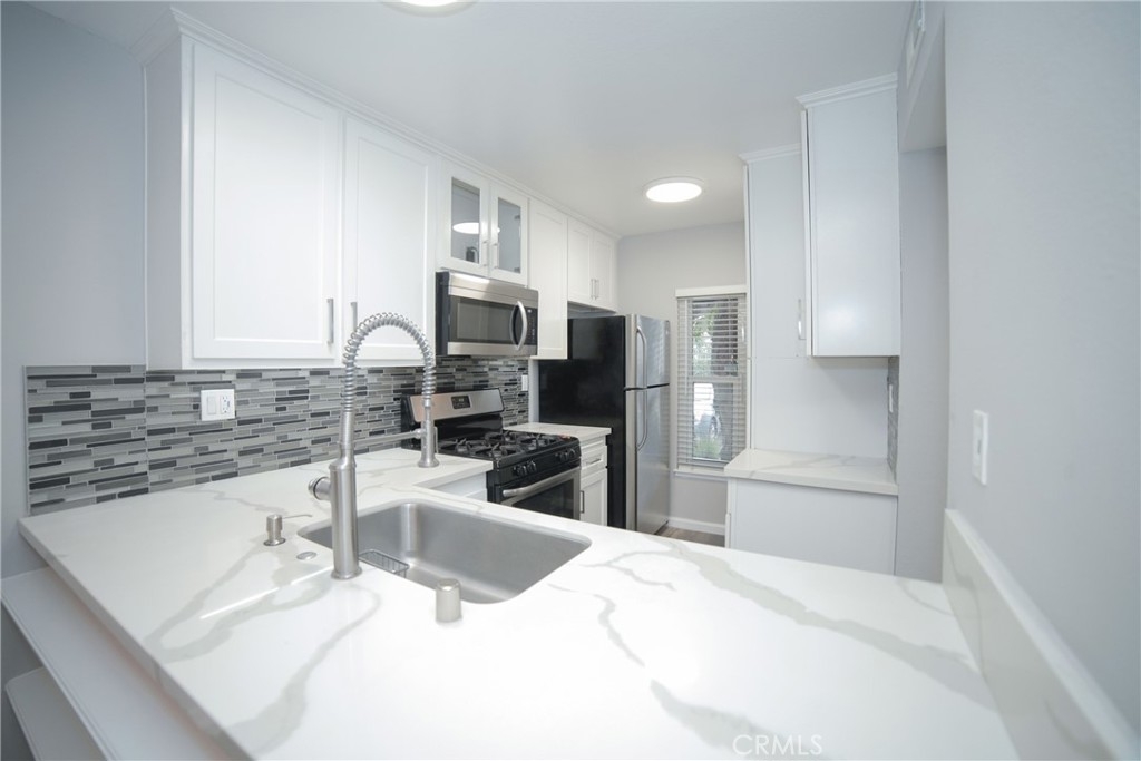 Magnificent Canoga Lakes remodeled downstairs 1 bedroom with enclosed patio and amazing views of the waterfalls and streams. Amenities include vinyl plank flooring, Kitchen with upgraded cabinets, Quartz countertops, Stainless steel appliances and bath with amazing shower, vanity and lighting fixtures. Washer and washer are conveniently located right in the unit and the refrigerator is also included. The unit has central air and heat. Parking is close to the unit with 2 spaces, and this is a ground level property with no stairs. Relax on the spacious enclosed patio with views of the lush landscaping, towering trees and waterfalls and streams. Water and trash are included in this well managed HOA along with earthquake insurance. Canoga Lakes is a gated resort-like community with pools, spas, saunas, lighted tennis courts and workout room. This wonderful complex is close to transportation, hospitals, "the village", Topanga Plaza Shopping Mall, Fallbrook Mall, Malibu Wines, restaurants and entertainment. You deserve the friendly and tranquil atmosphere here and you are going to love living in Canoga Lakes.