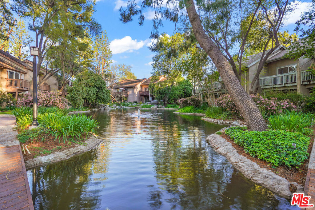 Explore the serenity of Canoga Lakes with this exclusive corner unit condominium, nestled in a secure, gated sanctuary surrounded by lush foliage, meandering streams, ponds, and cascading waterfalls. Step into the open concept unit to find a kitchen boasting exquisite Carrara marble countertops and state-of-the-art appliances. This ground-floor retreat offers the ease of in-unit laundry facilities and central AC/heat controlled by a Nest system, while a secluded patio invites you to immerse yourself in the beauty of the community's water features. The primary bedroom boasts a spacious walk-in closet and convenient en-suite access to the bathroom, complete with a luxurious soaking tub and shower. Amenities in this pet friendly complex include access to two pools, a spa, sauna, gym, and tennis courts. Unit comes with one assigned parking spot & HOA dues include trash, water and earthquake insurance. Ideally positioned within minutes of freeway access, boutiques, eateries, and Topanga Village. Don't miss out on this extraordinary opportunity!
