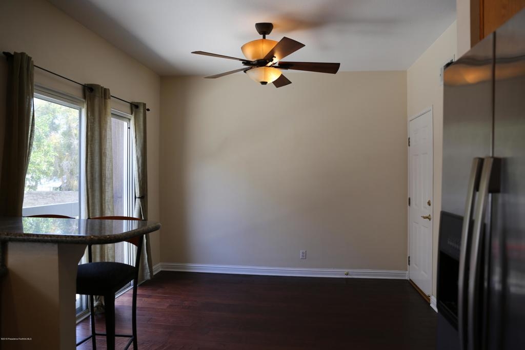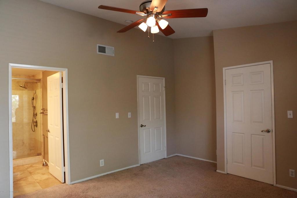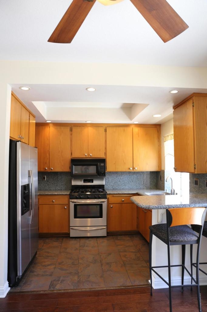 Hardwood floors welcome you home into a spacious living room with natural sunlight and mantled fireplace. The cozy kitchen is complimented with recessed lighting, tile flooring and granite counter tops. Enjoy the breakfast bar that overlooks the dining area. Master suite boast high ceiling, walk in closet, remodeled bath with glass enclosed shower featuring floor to ceiling travertine and dual shower-heads. Guest suite has private bath and walk in closet. Remote controlled ceiling fans with lighting accent dining room and both bedrooms. 2 car over-sized attached garage with additional storage space.